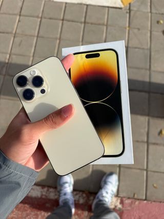 Teléfono móvil iPhone 14 Pro en color dorado. Estado de batería 78% 🔋 Almacenamiento 256gb Viene con su caja y cable Todas las piezas son originales nunca ha sido reparado POR FAVOR NO MAREAR EL PRECIO ES ALGO NEGOCIABLE 🛑 - Diseño elegante y moderno. - Acabado metálico premium.