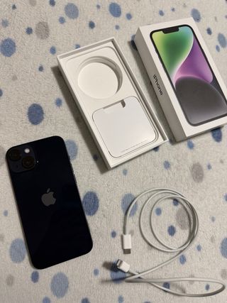 iPhone 14 en color Midnight con 128GB de almacenamiento. - Diseño elegante y moderno. - Pantalla nítida y vibrante. - Cámara dual avanzada para fotos y vídeos espectaculares. -Tiene partes del color quitadas, como se puede apreciar en la fotografia, es en las zonas de la cámara y algún lateral. -85% Salud de batería -Incluye fundas y cristal templado protector de pantalla -Incluye clavija apple para introducir tarjeta Sim