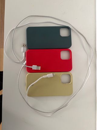 Conjunto de tres fundas para iPhone 12 y dos cables de carga. - Funda de color verde oscuro, impecable, sin marca. - Funda de color rojo, de la casa de las carcasas, impecable , costo 14 euros - Funda de color amarillo pálido, de la casa de las carcasas, usada, costó 20 euros - Dos cables de carga blancos de 1 m cada uno, impecables, costaron 8 euros cada uno. Todo el kit para que disfrutes de tu iphone, no se incuyen las bases de los cables