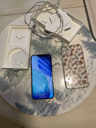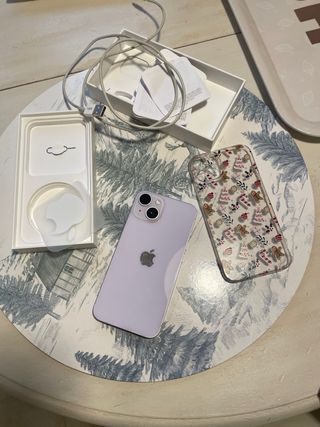 Teléfono móvil iPhone 14 con 128 GB de almacenamiento. - Incluye cable de carga USB-C. - Funda protectora transparente con diseño navideño. - Herramienta para extraer la tarjeta SIM. Salud bateria 84% Todo original
