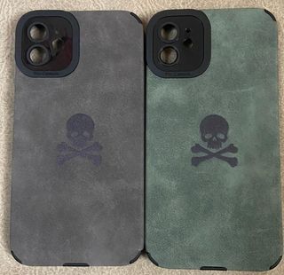 Funda de móvil de color beige claro para iPhone. Está en buen estado. - Marca: Scalpers - Material: Parece ser de un material tipo corcho o similar. - Diseño: Contiene un pequeño logo de calavera y tibias cruzadas en color dorado.