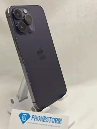 Este iPhone 14 Pro Max en color morado tiene una capacidad de almacenamiento de 128GB. Salud de Batería: 100% - Pantalla Super Retina XDR. - Chip A16 Bionic. - Sistema de cámaras Pro avanzado. Totalmente operativos. Signos de desgaste en la pantalla (p. ej.: pequeños arañazos). Puede haber algunos arañazos o golpes más fuertes en la parte trasera y el marco. Pueden aparecer mensajes de pantalla y batería compatibles. Con cable y estractor de tarjetas SIM. No incluye el embalaje original. Todos los accesorios especificados e incluidos en la entrega son completamente operativos.