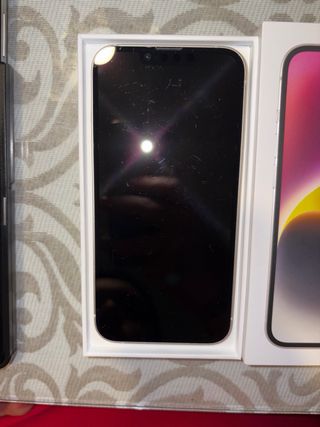 Teléfono móvil iPhone 14 en color morado malva y detalles plateados. - Se compro nuevo en Carrefour. - Tiene una fisura en la pantalla que no afecta al funcionamiento. De ahi el precio por si quieres cambiarla por tu cuenta. - El resto sin desperfectos, golpes o arañazos.