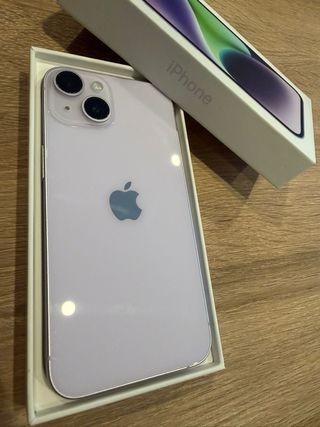 Teléfono móvil iPhone 14 con acabado en color morado. - Capacidad de almacenamiento de 128GB. - Salud batería 86%