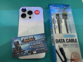 iPhone 14 Pro en color plata con 128GB de almacenamiento. Incluye cable de datos. - Capacidad de 128GB. - Color plata. - Con 1 año de garantía