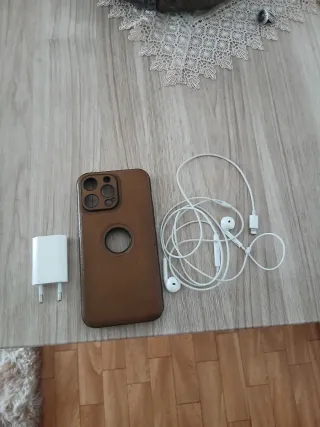 Conjunto de accesorios para iPhone 14 pro max - Funda de color marrón. - Auriculares blancos con cable. - Cargador blanco.