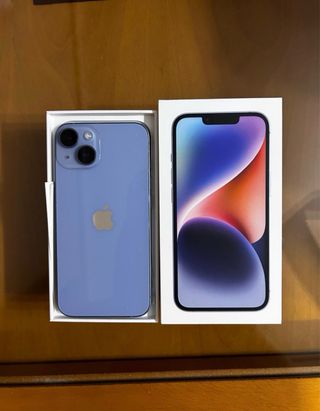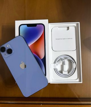 Teléfono móvil iPhone 14 con acabado en color azul. - Capacidad de almacenamiento de 128GB. Se entrega con caja, cable y 3 fundas, cristal templado colocado y en perfecto estado, factura y garantía hasta 23/12/2025 No interesan cambios y no se hacen envíos.