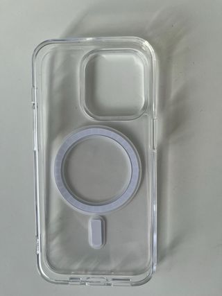 Funda protectora transparente para iPhone 15 Pro. - Diseño claro que muestra el color original del teléfono. - Incorpora anillo magnético para carga inalámbrica. - Bordes reforzados para mayor protección.
