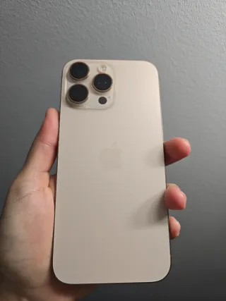 Este iPhone 16Pro Max en color dorado es un dispositivo elegante y potente. - Pantalla de 6.7 pulgadas. - Sistema de cámara avanzado. - bateria 99% -ciclos carga 177