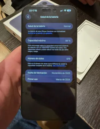 iPhone 15 Pro Max con 84% de capacidad máxima de batería. - Salud de la batería: Normal. - Número de ciclos: 679. - Fecha de fabricación: Noviembre de 2023. - Primer uso: Marzo de 2024.