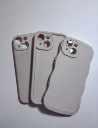 Pack de tres fundas para iPhone 15. Diseños modernos y protección. - Funda lisa color beige. - Funda lisa color beige con borde. - Funda con diseño ondulado color beige.