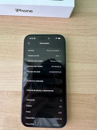 iPhone 15 Pro con 256GB de almacenamiento. Batería en 86% como puede ver la tapa trasera está rota un poquito nada grave el móvil funciona de maravilla es de mi uso personal quiero un s25 plus. Entrego con su funda
