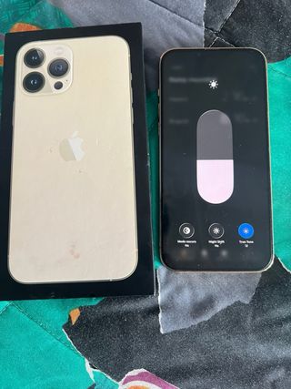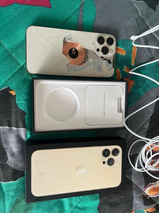 iPhone 13 Pro Max con 256GB de almacenamiento en color dorado. - Pantalla Super Retina XDR. - Chip A15 Bionic. - Sistema de cámaras Pro avanzado. - Batería de larga duración. -cubierta dañada