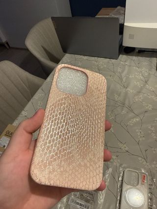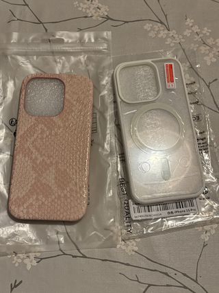 Dos fundas para iPhone 15 Pro. - Una funda con diseño de piel de serpiente en color rosa. - Una funda transparente con MagSafe.