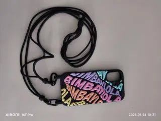 Funda para iPhone 16 con diseño de la marca Bimba y Lola. Presenta un estampado de letras en varios colores sobre un fondo negro. - Estampado de letras Bimba y Lola en relieve. - Colores del estampado: rosa, morado, azul, verde, amarillo y naranja. - Incluye cordón negro para llevarla colgada.