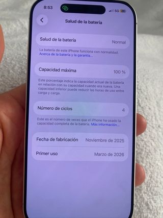 iPhone 17 en color blanco con 256GB de almacenamiento. - Capacidad máxima de la batería: 100% - Número de ciclos: 4 - Fecha de fabricación: Noviembre de 2025 - Primer uso: Marzo de 2026 PVP nuevo: 937€ Precio de venta: 870€