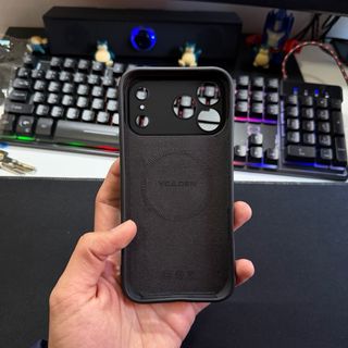 Funda negra para iPhone 17 Pro Max con diseño exclusivo. - Nuevo, sin estrenar - Material de cuero. - Detalle de cruces y logo de la marca. - Acabado texturizado.