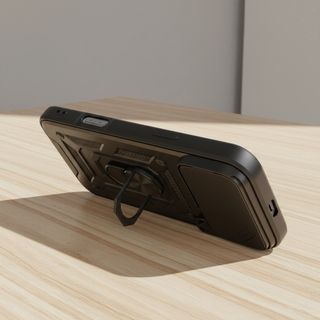 Funda protectora para iPhone 17 Pro en color negro. La anilla es giratoria 360 grados