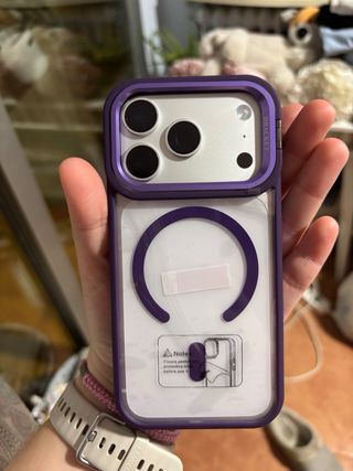 Funda protectora para iPhone 17 Pro en color morado. Es un accesorio nuevo, sin usar. - Diseño con protección para las cámaras. - Incorpora anillo magnético para accesorios. - Material transparente en la parte trasera.