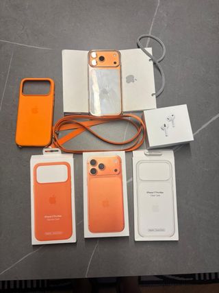 📱 IPHONE 17 PRO MAX 256GB – PACK PREMIUM 🍊 Vendo iPhone 17 PRO MAX 256GB – Versión USA (LTE), SIN SIM física, solo eSIM. 🔸 Color: Orange Cosmic ✨ 🔸 Estado: IMPECABLE — sin un solo rasguño 🔸 Batería: 🔋 100% 🔸 Antigüedad: 5 meses — comprado el mismo día del lanzamiento (septiembre 2025) en Apple Store San Francisco (USA) — se entrega con factura original ✅ 🎁 INCLUYE PACK COMPLETO (TODO ORIGINAL APPLE): • iPhone 17 Pro Max 256GB Orange Cosmic • Clear Case original Apple (transparente) • Funda naranja original Apple • Strap / cinta original Apple para colgar • AirPods Pro 3 originales Apple 💶 PRECIO PACK COMPLETO: 1.500€