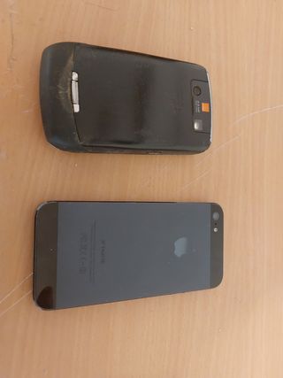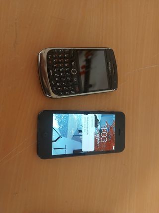 Vendo dos teléfonos móviles usados: un iPhone 4 y una BlackBerry. Ambos presentan señales de uso. - El iPhone 4 está en buen estado, funciona pero está bloqueado - La BlackBerry tiene algunos arañazos, no tiene batería y (desde que lo abrió para ver la bateria) no cierra bien. Ver foto.