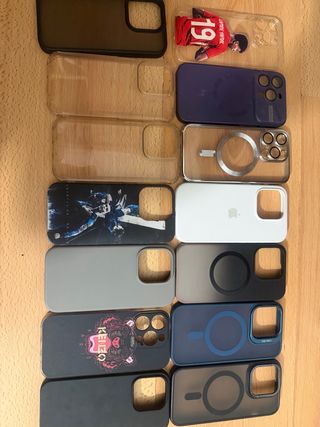 Lote de fundas para iPhone 15 Pro. - Funda transparente con diseño de futbolista. - Funda morada. - Funda transparente con MagSafe. - Funda blanca con logo de Apple. - Funda gris. - Funda negra con diseño de tigre. - Funda azul con MagSafe. - Funda negra con MagSafe. Vendo cada funda por 5€, leer antes de decir que pone 0 en el precio, puedo venderlas por unidad suelta.