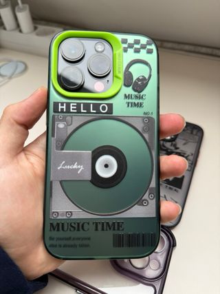 Lote de tres fundas para iPhone 14 Pro. 5 EUROS CADA UNA - Funda morada con detalles en rosa metálico. - Funda transparente con marco negro y detalles en cobre metálico. - Funda verde oscuro con marco verde iridiscente.
