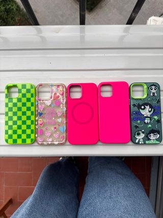 Pack de cinco fundas para iPhone 12 con diferentes diseños. - Funda verde con estampado de cuadros. - Funda transparente con corazones y texto. - Funda rosa neón. - Funda rosa neón. - Funda verde con estampado de Las Supernenas.