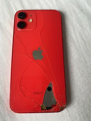 Teléfono móvil iPhone 12 mini en color rojo, cristal de pantalla roto pero no influye en su funcionamiento, tapa trasera rota, cámaras y face id funcionan correctamente - Pantalla de 5.4 pulgadas. - Chip A14 Bionic. - Sistema de cámara dual. - Carga inalámbrica MagSafe.