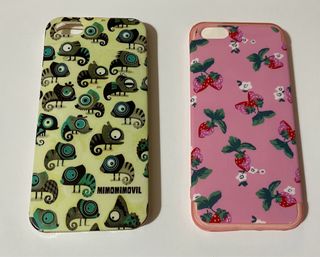 Dos fundas para iphone 5/5S/5SE, tambien compatible con iphone 6. La rosa, de estampado de fresas no tiene ningún uso. La beigue, de camaleones, se usó una semana escasa (se me estropeó el movil).