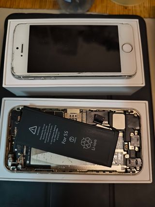 Teléfono móvil iPhone 5S, ideal para obtener componentes o para reparar. Salvo el roto y que la pantalla está muy levemente despegada, el teléfono está libre y funciona bien. - Color blanco.