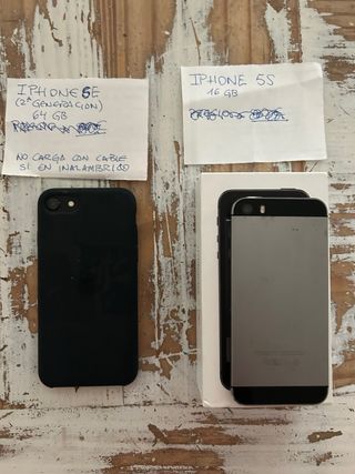 Lote de 2 iPhones: - iPhone 5S 16 GB - iPhone SE (2ª Generación) 64 GB Funcionan y pueden usarse sin problemas. El iPhone SE no carga con cable, sí en inalámbrico. Precio de lote, se venden por separado 30€ el Iphone 5 y 50€ el SE.