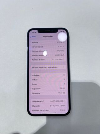 El precio mostrado es el de venta en nuestra tienda. El precio de este producto en nuestra página web puede ser diferente. Este artículo está disponible en nuestra tienda de Madrid. apple iphone 12 128gb CC033_E10559832_0 es un objeto que se ofrece en estado correcto. Todos nuestros productos cuentan con garantía de 3 años y un plazo de devolución de 14 días. Modelo: Iphone 12 128gb | Color: Blanco | Pulgadas: 6 | Capacidad: 128 | Operador: Libre | Megapixels: 12 | Memoria ram: 4 | 3g: 5g | Sistema operativo: Ios | Caja original: Si | Numero de sim: 2 (dual-sim) | Porcentaje de bateria: 85 | Cable cargador: Si | Vida util bat