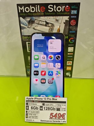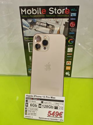 Apple iPhone 13 Pro Max en color oro con 128GB de almacenamiento. -Chip A15 Bionic. -Pantalla Super Retina XDR de 6.7". -Batería de 3700 mAh carga rápida de 20W. -Grado A. Todos nuestros artículos de segunda mano han sido testeados debidamente para comprobar su correcto funcionamiento. Damos 1 año de garantía en artículos usados y 3 años en artículos nuevos. Quieres verlos? Pásate por alguna de nuestras tiendas: MOBILE STORE MALAGA Avda. de la Aurora, 19 Calle Armengual de la Mota, 10 MALAGA Teléfono (Whatsapp): 627 119 234 Compramos también teléfonos, incluso con avería. Nuestras valoraciones nos avalan.