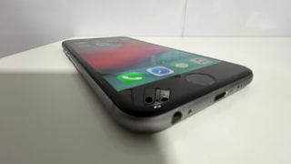 Teléfono móvil iPhone 6S Plus en color plata y blanco. Tiene la minúscula muesca de la foto y la salud de batería al 75%. NO incluye ni cable ni cabezal de carga. - Capacidad de 128GB. - Salud de batería del 75%.