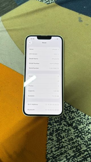 iPhone 13 en color blanco con 128GB de almacenamiento. - Modelo: iPhone 13 - Capacidad: 128 GB - Color: Blanco - Versión iOS: 26.2 - Número de modelo: MLPG3PM/A - Número de serie: FJ6V369C75