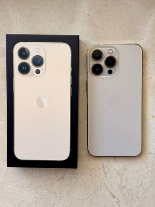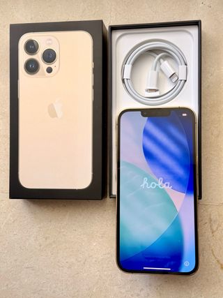 Teléfono móvil iPhone 13 Pro en color dorado. Incluye cable de carga y caja original . Nunca reparado, sin un arañazo, siempre con funda y salva pantalla. - Pantalla de 6.1 pulgadas. - Sistema de triple cámara. - Capacidad de almacenamiento de 256 GB.