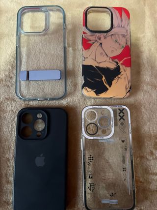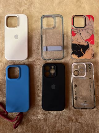 Conjunto de seis fundas para iPhone 14 Pro. - Funda blanca con logo de Apple. - Funda transparente con soporte. - Funda con diseño de Goku. - Funda azul con cordón. - Funda negra mate con logo de Apple. - Funda transparente con diseño gráfico.