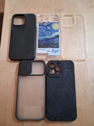 Lote de cinco fundas para iPhone, creo que para Iphone 14 Pro Max. Incluye fundas transparentes y negras. Funda negra mate. Funda transparente con borde.- Funda transparente con diseño de Van Gogh. Funda semitransparente con protector de cámara. Funda negra de caritas sonrientes. El lote 6, si te interesa alguna en particular 2 euros.
