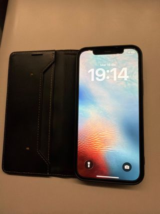 Teléfono móvil iPhone 12 Pro en color negro. - Pantalla de 6.1 pulgadas. - Sistema de triple cámara. - Capacidad de almacenamiento de 128 GB. - Funda de libro protectora. - Protector de pantalla y de cámaras. - Caja original. - Cargador original Apple y posibilidad a mechero coche. - con nuevo IOS 26.2