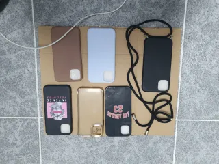 Lote de fundas para iPhone 12 en diferentes colores y estilos. - Funda transparente con MagSafe 6€ - Funda rosa con texto. - Funda azul. - Funda morada con MagSafe 6€ - Funda roja. - Funda amarilla translúcida.