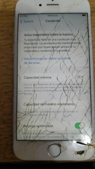Funciona perfectamente, lo puedes utilizar para piezas o reparar bateria y pantalla. iPhone 6S en color plata y blanco. La batería se encuentra en condición degradada, con una capacidad máxima del 36%.
