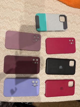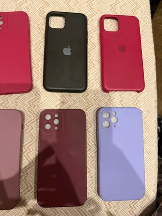 Pack de seis fundas para iPhone 11 Pro. - Fundas de silicona. - Colores variados: rosa, negro, rojo, burdeos y lila. - 2 oroginales de Apple - Una con rozaduras de uso