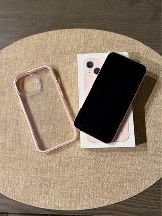 Teléfono móvil iPhone 13 con acabado en color rosa y 128GB de almacenamiento. - Pantalla de 6.1 pulgadas. - Sistema de cámara dual avanzado. - Chip A15 Bionic. - Batería 76% - fundas y protector de pantalla de regalo - Caja con cable incluido