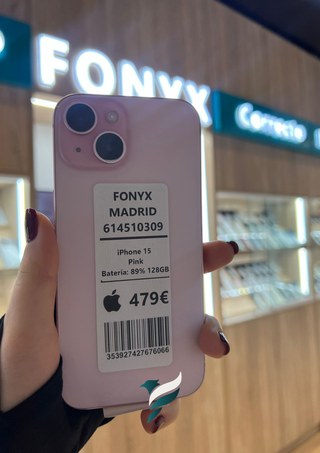 🚨 ¡SOLO PARA LOS MÁS RÁPIDOS! 😱 iPhone 15 128GB 🔹 Color: Pink 🔋 Batería: 89% 🎁 Incluye funda y cable de carga 🛡️ Garantía: 6 meses 📍 Calle de la Princesa 71, Madrid 🏬 FONYX 📞 614 510 309