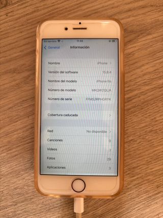 Teléfono móvil iPhone 6s con sistema operativo iOS 15.8.4. - Modelo: iPhone 6s - Versión de software: 15.8.4 - Número de modelo: MKQW2QL/A - Número de serie: FFMSJRPHGRYK