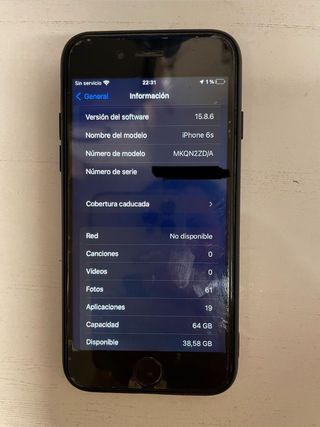 iPhone 6S de 64GB muy bien cuidado. Salud de la batería al 75%. Tiene una pequeña marca apenas perceptible según puedes ver en la foto (con la funda queda oculta). No incluyo auriculares. Incluye cargador, pincho para SIM, documentación y embalaje originales. Regalo funda color verde turquesa en perfecto estado.