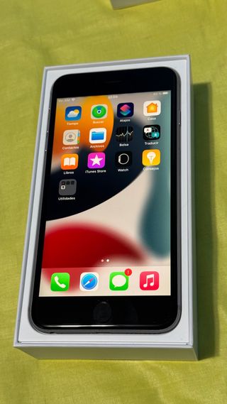 Teléfono móvil iPhone 6S Plus en aluminio de color gris espacial. Capacidad 64 GB. Pantalla Retina HD de 5,5”. Versión : iOS 15.8.5. Accesorios originales incluidos. - Caja original. - Cargador original Apple. - Cable de carga original USB-A Lightning. - Auriculares originales EarPods con conector jack 3,5 mm. - Pincho de apertura de compartimento para Sim ( nano-SIM). Compatible con App WhatsApp. Factura de compra. Batería reemplazada en servicio técnico oficial Apple en 2021. Único dueño. Siempre protegido con funda y protector de pantalla de cristal templado.