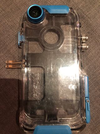 Se vende funda sumergible para iPhone 6/6S en color azul. Está en buenas condiciones, aunque presenta algunas marcas de uso. - Compatible con iPhone 6 y 6S. - Permite la toma de fotos y videos bajo el agua. - Incluye accesorio para montaje.