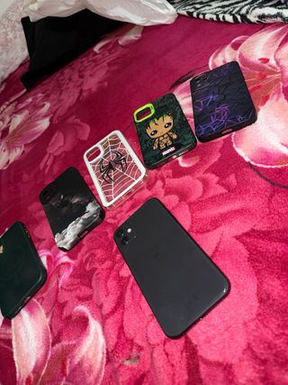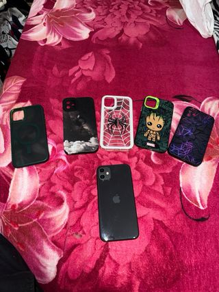 iPhone 11 en color negro, acompañado de seis fundas protectoras y un vidrio templado. batería en 75% sin arañazo ni detalles está como nuevo - Funda transparente con diseño de telaraña. - Funda con diseño de Groot de Marvel. - Funda con diseño abstracto morado. - Funda con diseño de nubes. - Funda verde. - Funda negra.